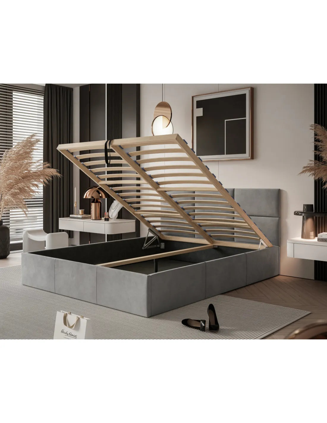 PORTO gulta ne tikai rotā guļamistabu, bet arī nodrošina komfortu un praktiskumu: zem matrača atrodas ietilpīga gultasveļas kaste, kas ir ērti pieejama, pateicoties uzticamam, ar atsperēm pastiprinātam pacelšanas mehānismam.