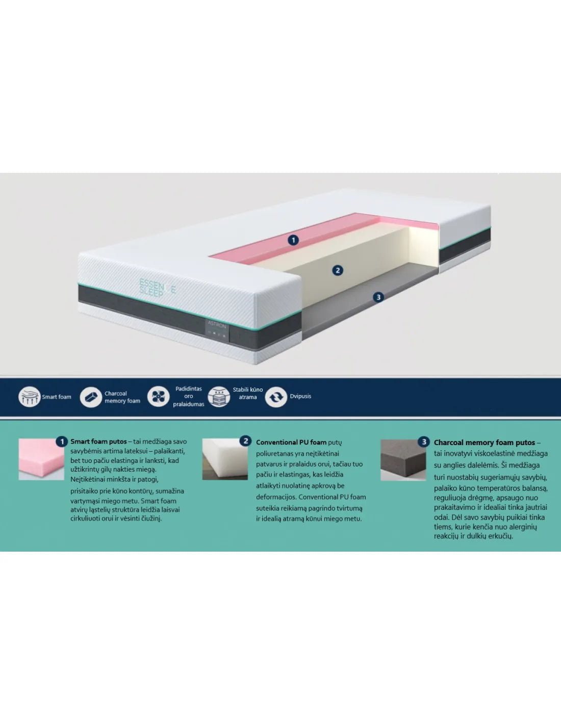 Matrača poliuretāna putu kodolu ieskauj inovatīvas Smart putas un Charcoal atmiņas putas. Viedās putas ir lateksa aizstājējs, kas ir neticami mīksts un ērts. Kokogles atmiņas putas - uztur ķermeņa temperatūras līdzsvaru, veic termoregulācijas funkciju un novērš svīšanu. Ar ESSENCE SLEEP ASTRON matraci jūs gulēsiet ilgāk un ērtāk.